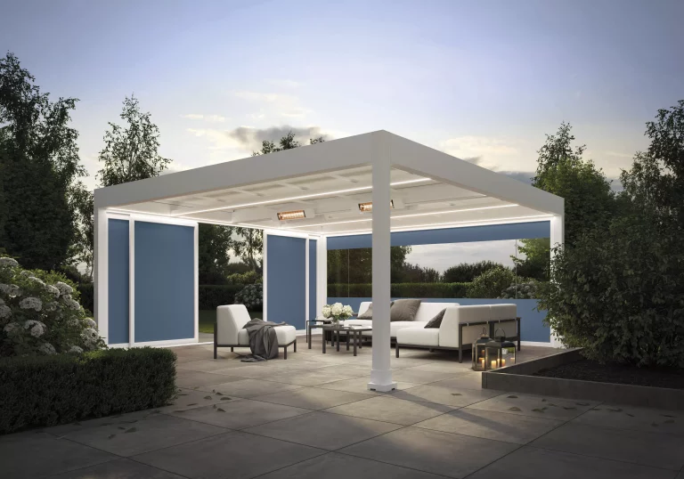 The Markant can be individually planned to suit your needs. Whether that be just a textile roof with open sides or full side blinds too to make a secure and protected outside area. The Markant frame can be paired with awnings to cover large spaces to make a sticking outside space.